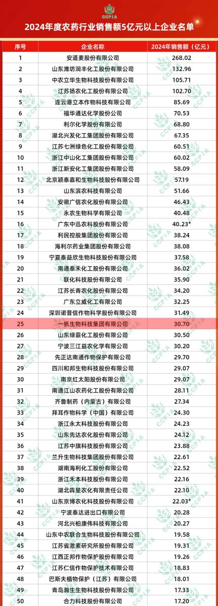 喜报!一帆荣获2024年度农药行业销售额企业名单第25名!